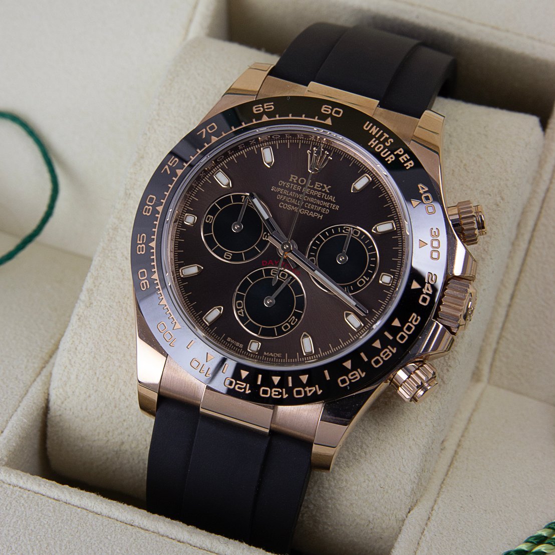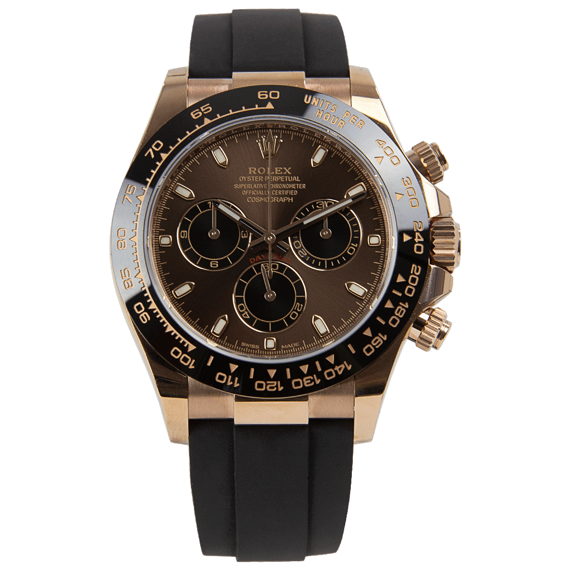 40mm 18kt Everose Gold Case, Fixed Black Ceramic Bezel With Engraved Tachymetric Scale, Chocolate Dial With Black Sub-Dials, Automatic Movement With Chronograph Function, On a Black OysterFlex Rubber Strap.
