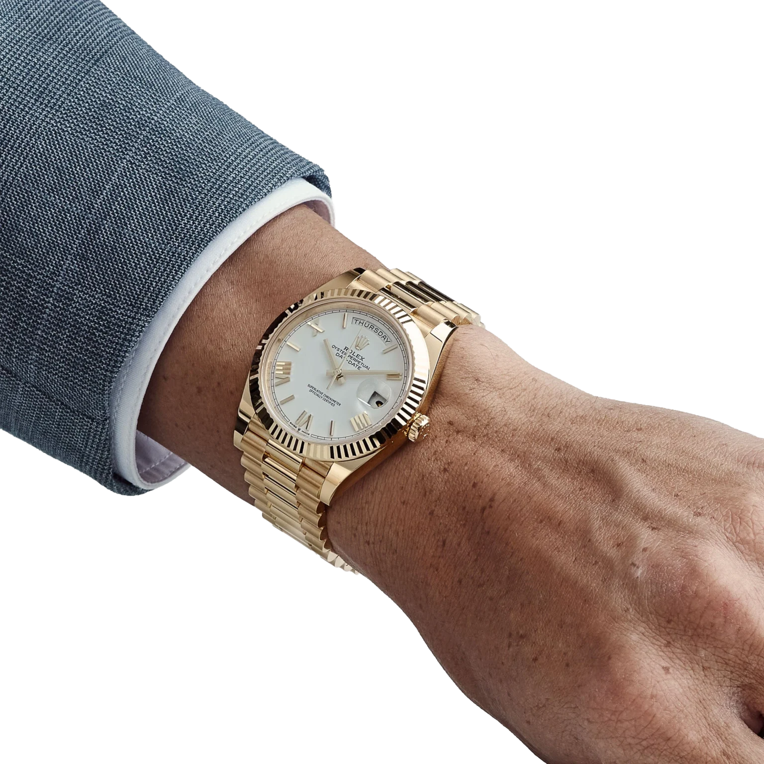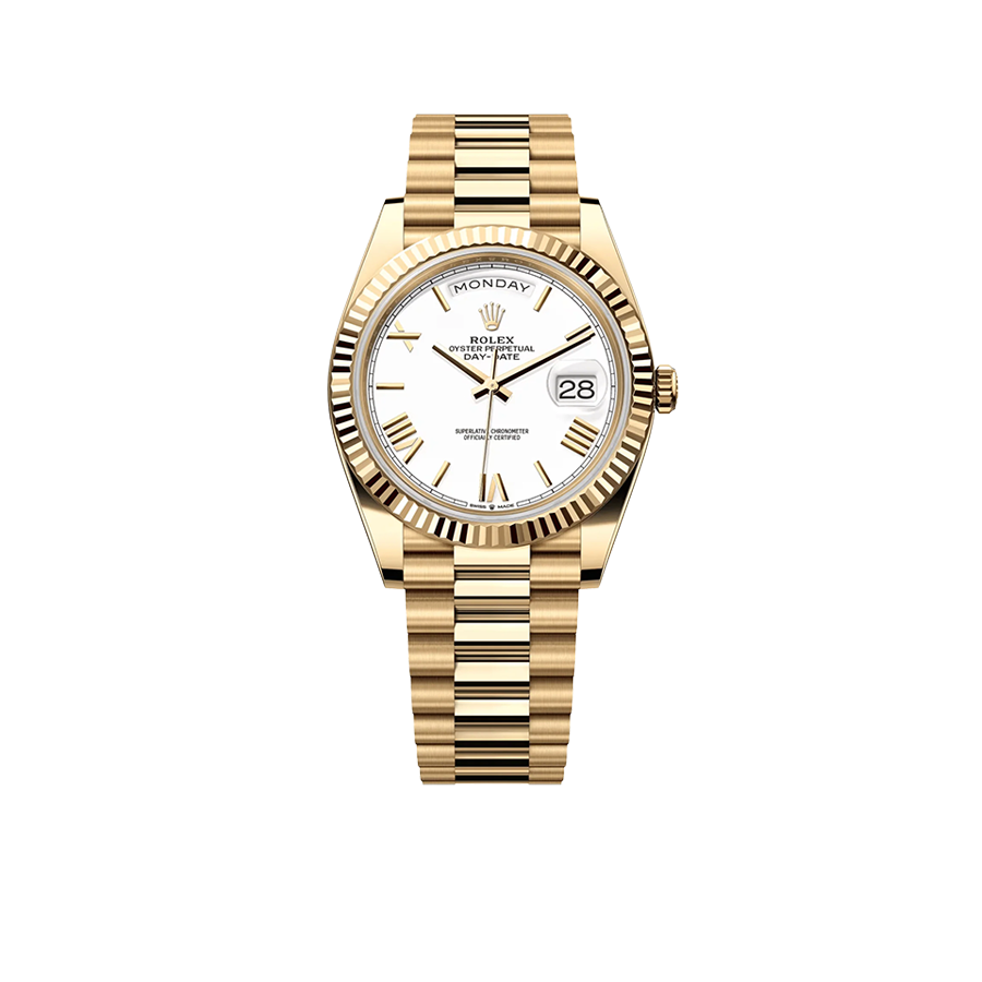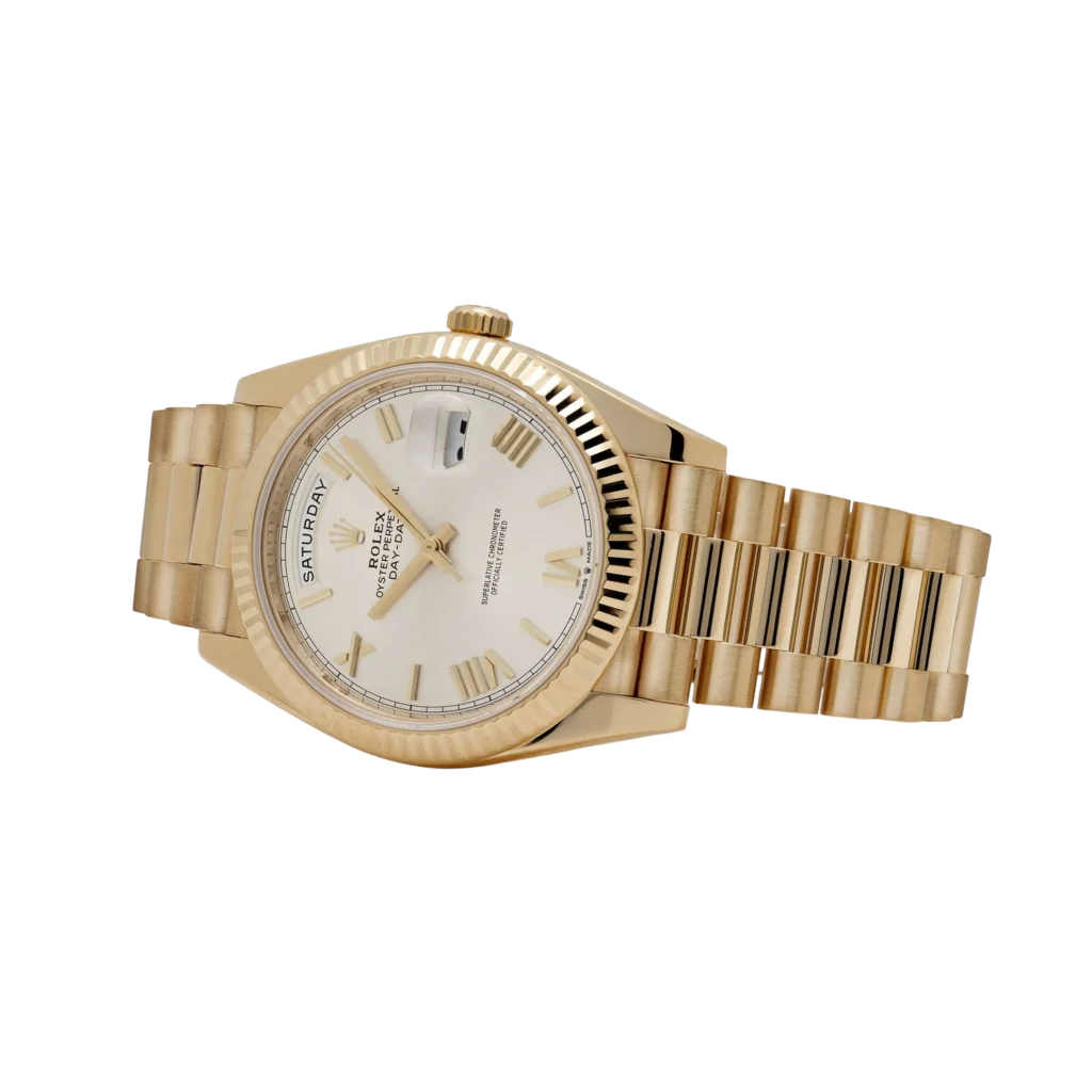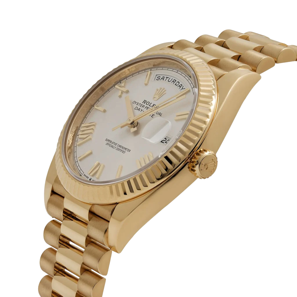 The Rolex DayDate 228238-0042 is made of 18ct. gold. It is a mixture of different 18 ct. gold metals including yellow, pink and white in even proportions of silver and copper. Made in an in-house laboratory by hand, each piece is meticulously inspected and shaped with the attention to detail Rolex is known for. The silver dial is fashioned with hour marks as Roman numerals that are fashioned for 18 ct. gold to prevent tarnish from developing. This watch is accuracy in motion and it is all latched together with 18 ct. gold links and clasps.